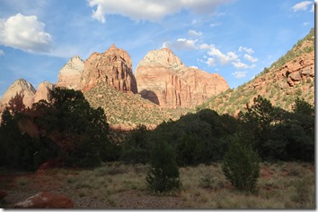 Bryce and Zion are different in several ways. In Bryce we drove along the side of the canyon and viewed it from the top or hiked down into the canyon. In Zion we drove and hiked along the bottom of the canyon carved by the Virgin River. In Zion there is more white, tan and gray sandstone and less of the red for which Bryce is famous.