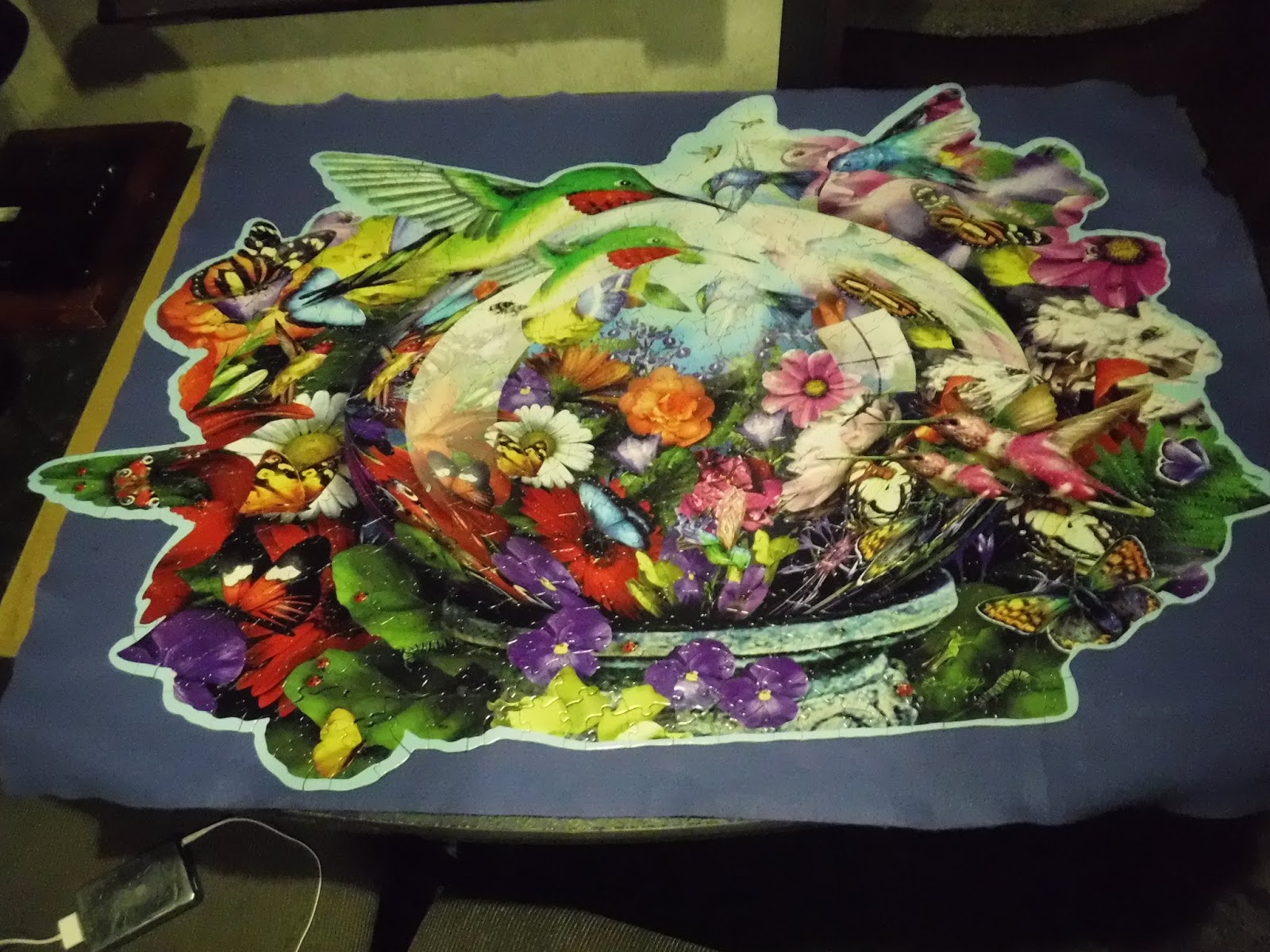 I found this one interesting because of it's size--26"x37" with only 600 pieces, and because it's a puzzle within a puzzle. Sprinkled through the picture are 13 ladybugs, 8 ants, 5 bees, 2 caterpillars, and 1 grasshopper. I also enjoyed counting the hummingbirds (8) and the butterflies (13). Another interesting facet is that the center of the picture is a globe which mirrors the outside edges. For instance, there is only one ruby throated hummingbird.