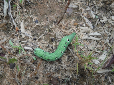 This fierce looking caterpillar is a real fake. When disturbed it draws its head in which makes its big "eyes" stand out.